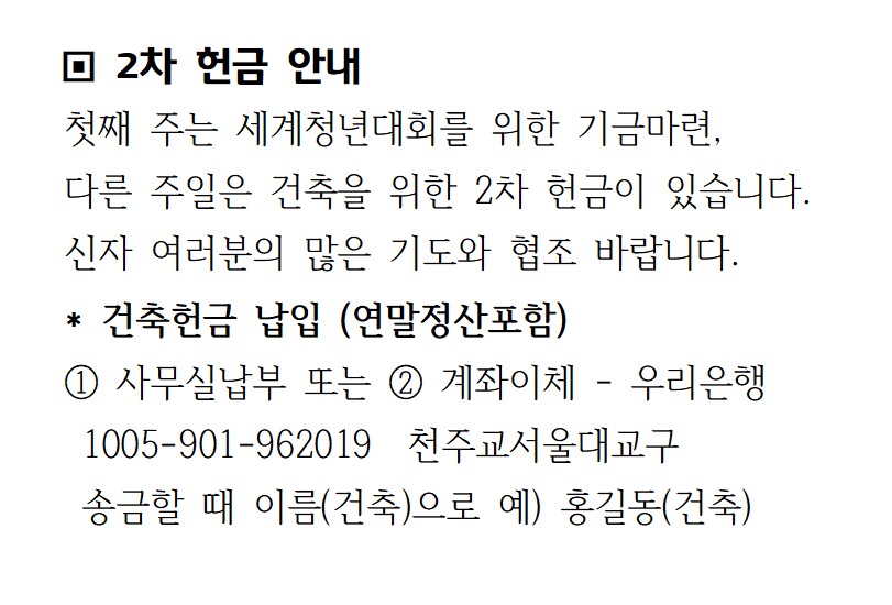 주일 2차헌금 안내 페이지 정보 작성자 최고관리자 댓글 0건 조회 330회 작성일 26-02-18 11:37 목록 본문 . 이전글2026년 성주간, 주님부활대축일 전례안내 26.03.29 다음글2026년 부활판공성사, 사순시기 십자가의길 안내 26.02.18