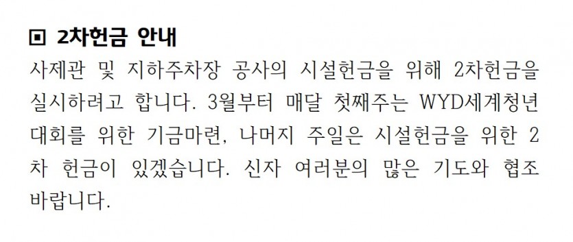 주일 2차헌금 안내 페이지 정보 작성자 최고관리자 댓글 0건 조회 110회 작성일 26-02-18 11:37 목록 본문 . 이전글[생명분과]2026년2월호_생명을 위하여 26.02.18 다음글2026년 부활판공성사, 사순시기 십자가의길 안내 26.02.18