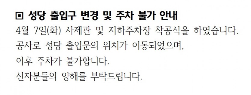 성당출입구 변경 및 주차 불가안내 페이지 정보 작성자 최고관리자 댓글 0건 조회 133회 작성일 26-04-09 16:52 목록 본문 . 이전글[생명분과]2026년4월호_생명을 위하여 26.04.17 다음글2026년 성주간, 주님부활대축일 전례안내 26.03.29