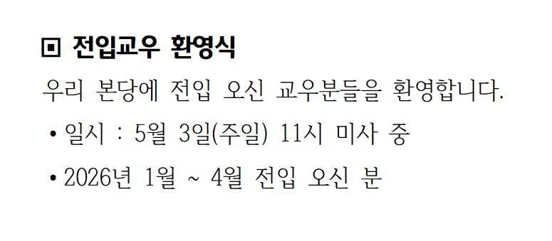 [2026년 5월] 전입교우환영식 페이지 정보 작성자 최고관리자 댓글 0건 조회 63회 작성일 26-04-22 11:35 목록 본문 . 다음글2026년 성모성월 묵주기도 26.04.22