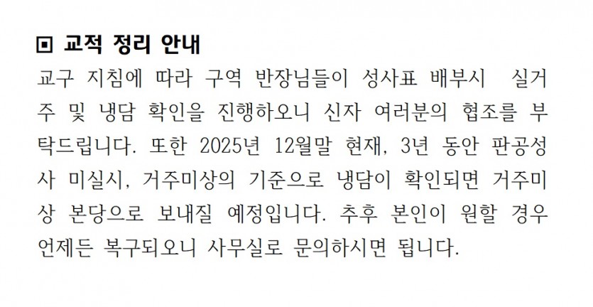 2025년 전신자 교적정리 페이지 정보 작성자 최고관리자 댓글 0건 조회 161회 작성일 25-11-22 16:13 목록 본문 . 이전글연말정산시 종이기부금 영수증발급 불가 25.11.22 다음글2025년 성탄판공성사 25.11.22