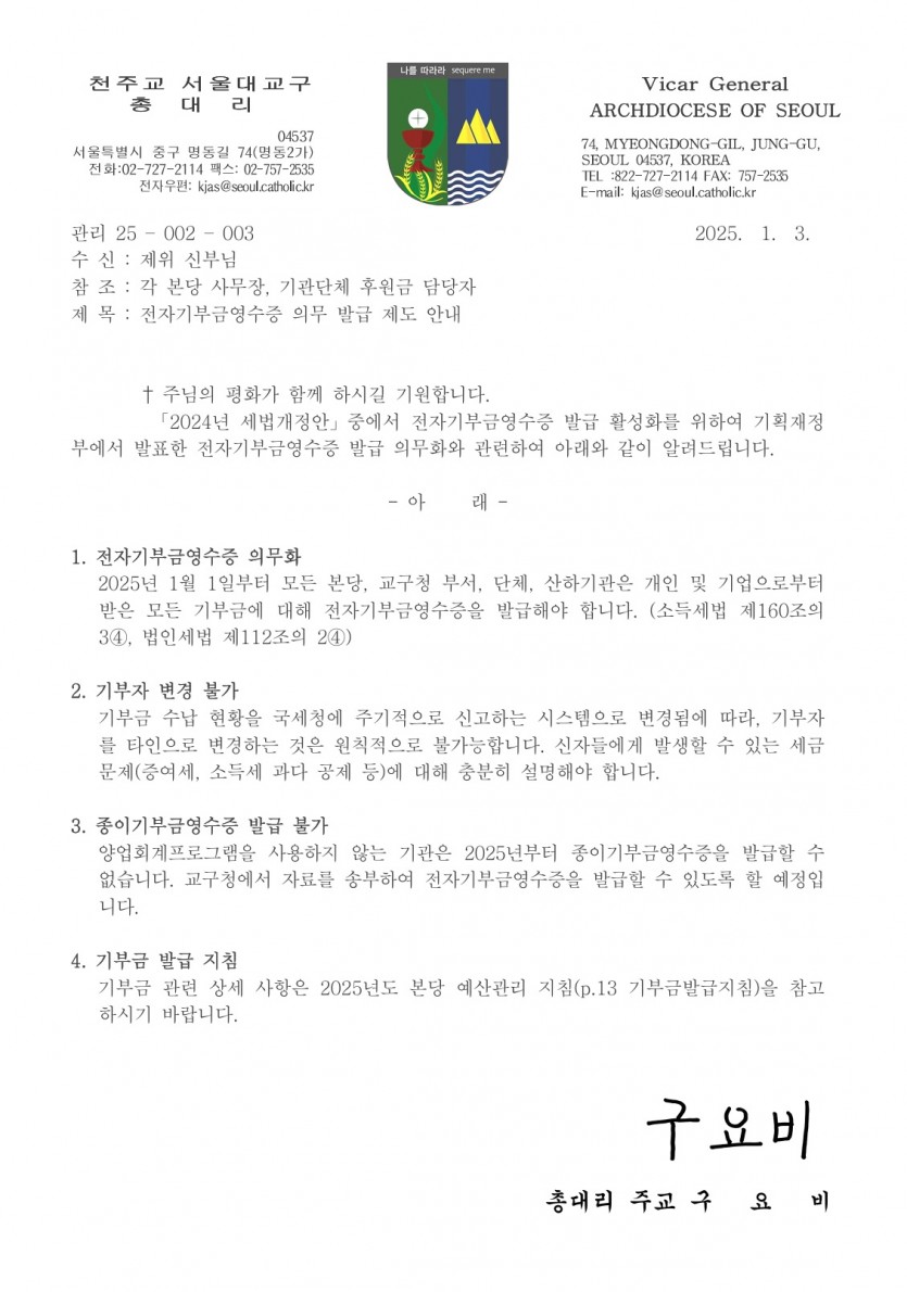 연말정산시 종이기부금 영수증발급 불가 페이지 정보 작성자 최고관리자 댓글 0건 조회 114회 작성일 25-11-22 17:44 목록 본문 . 이전글2025년 교무금확인및 2026년 달력수령 25.11.29 다음글2025년 전신자 교적정리 25.11.22